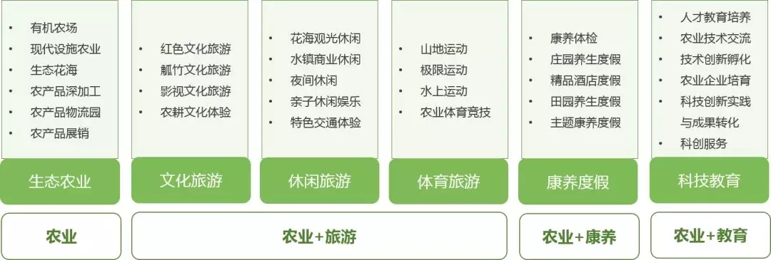 立足農(nóng)業(yè)生產(chǎn)基礎(chǔ),以農(nóng)業(yè)產(chǎn)業(yè)化發(fā)展、農(nóng)村創(chuàng)新城鎮(zhèn)化發(fā)展及農(nóng)民職業(yè)化發(fā)展為目標(biāo),以“農(nóng)業(yè)+N”模式著力打造新型農(nóng)業(yè)產(chǎn)業(yè)鏈,打造農(nóng)業(yè)跨界發(fā)展道路,形成可持續(xù)增長(zhǎng)的農(nóng)業(yè)經(jīng)濟(jì)體,主要融合旅游、康養(yǎng)、教育三大產(chǎn)業(yè)。