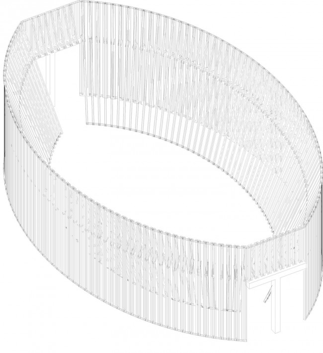 Povera Pavilion 是為Almada歌劇節(jié)慶祝藍色劇院(Teatro Municipal Joaquim Benite, 由Manuel Gra?a Dias與Egas José Vieira設(shè)計)10周年而搭建的。這座橢圓形的建筑,使用的材料是粗加工的松木條,設(shè)計師通過展示原始的質(zhì)感為設(shè)計增色。通常在劇院中支撐舞臺布景的三角形構(gòu)件,經(jīng)過設(shè)計,作為一種全新的元素構(gòu)成了整座建筑。一根柱體