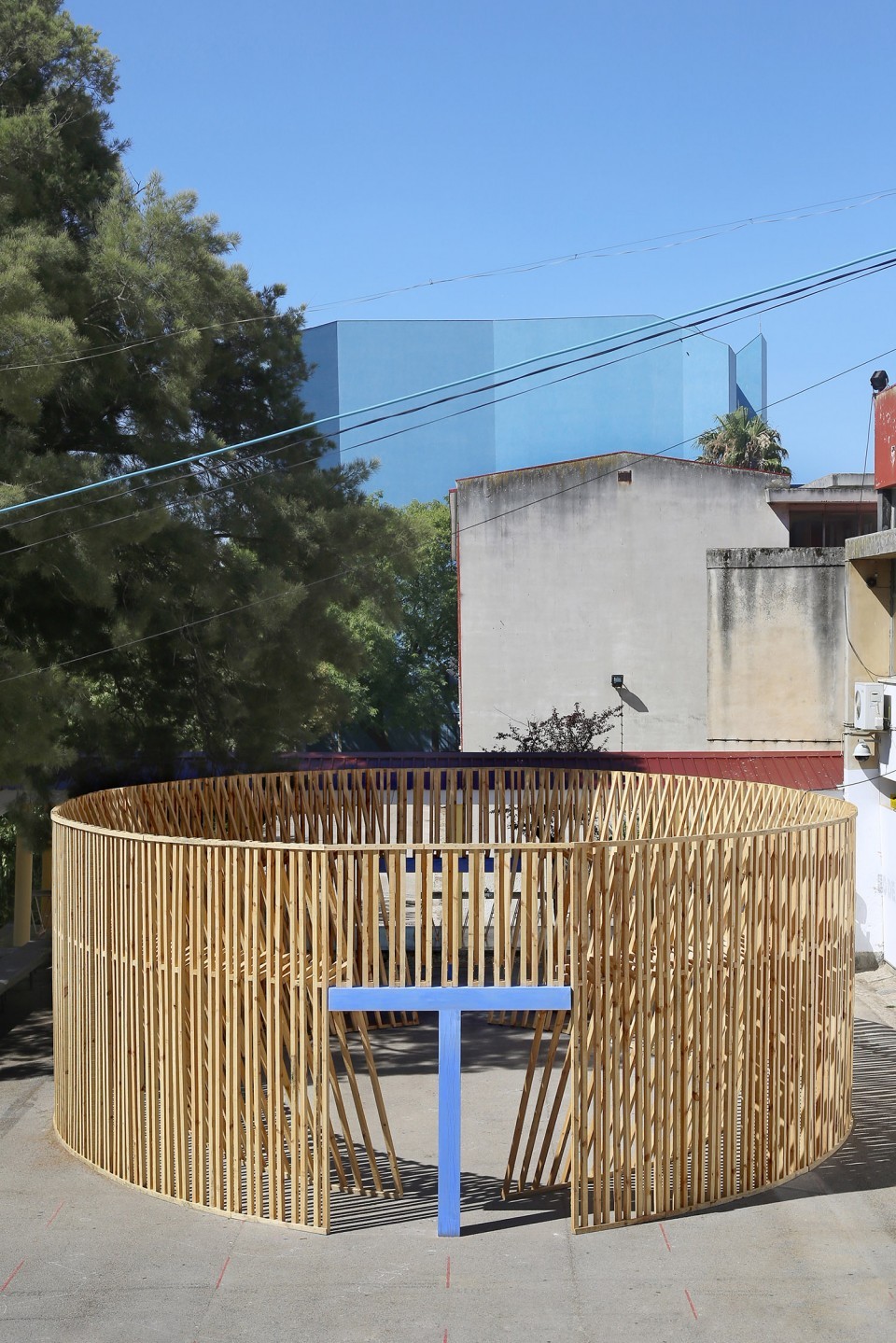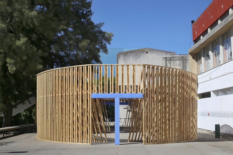 POVERA Pavilion was conceived for the Almada Theater Festival in order to celebrate the 10th anniversary of the Blue Theater (Teatro Municipal Joaquim Benite, by Manuel Gra?a Dias and Egas José Vieira). It is an elliptical structure made out of pine wood with a rough finishing which exposes and accepts his artisanal condition as an added value. It was developed and build together with a group of seven students. The small triangular element that is usually used in theater as a physical support for the bidimensional scenogaphies (and hidden behind the stage) was redraw as a new element that generates the whole project. The invisible element is taken from his original context and used with very different proportions as to assume itself as the central element. A column and a beam in both extremes give stability to the overall structure and define the entrance. Those crucial constructive elements appear almost with a figurative character due their flat finishing, color and position since they are facing the two existing theaters there.