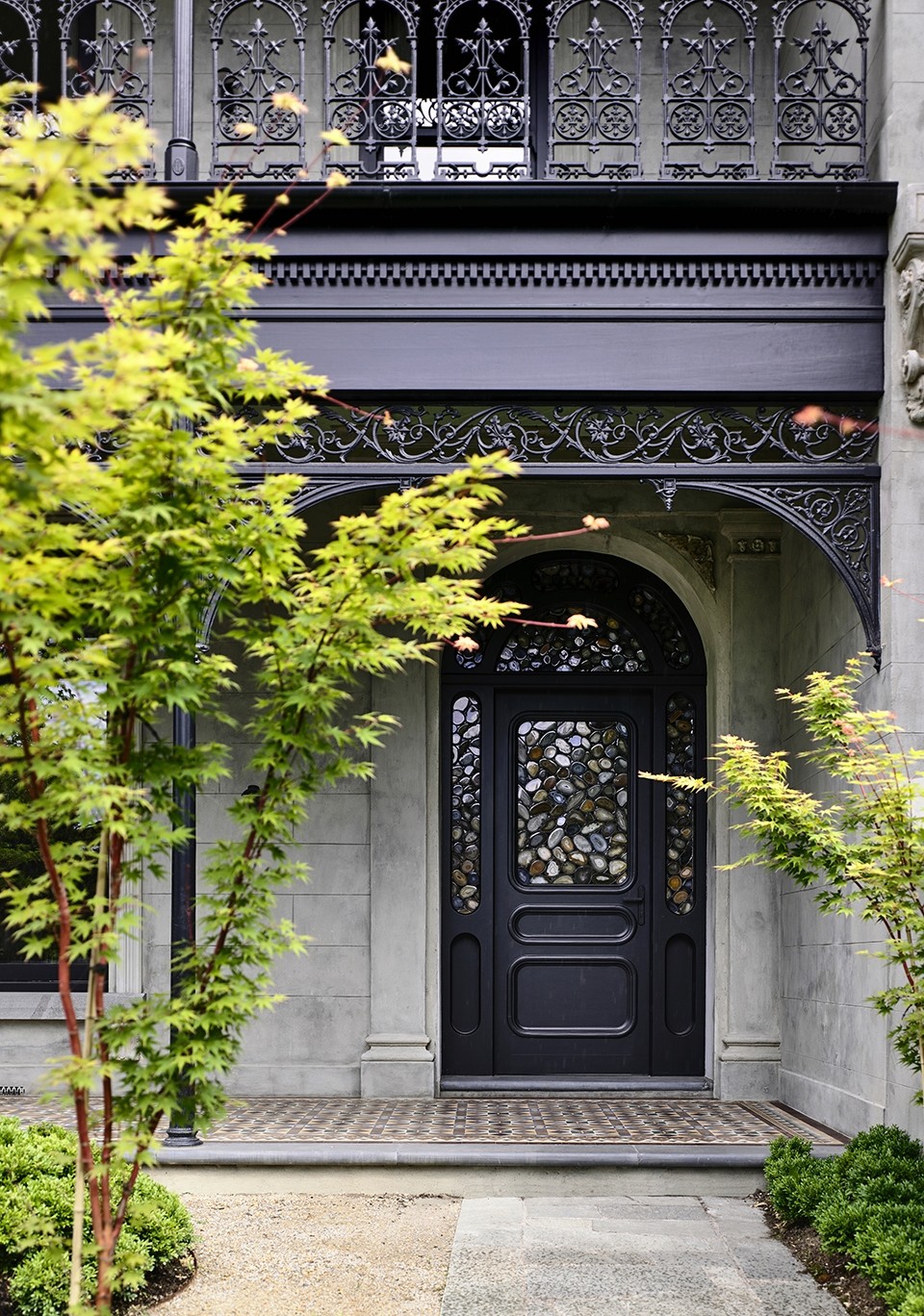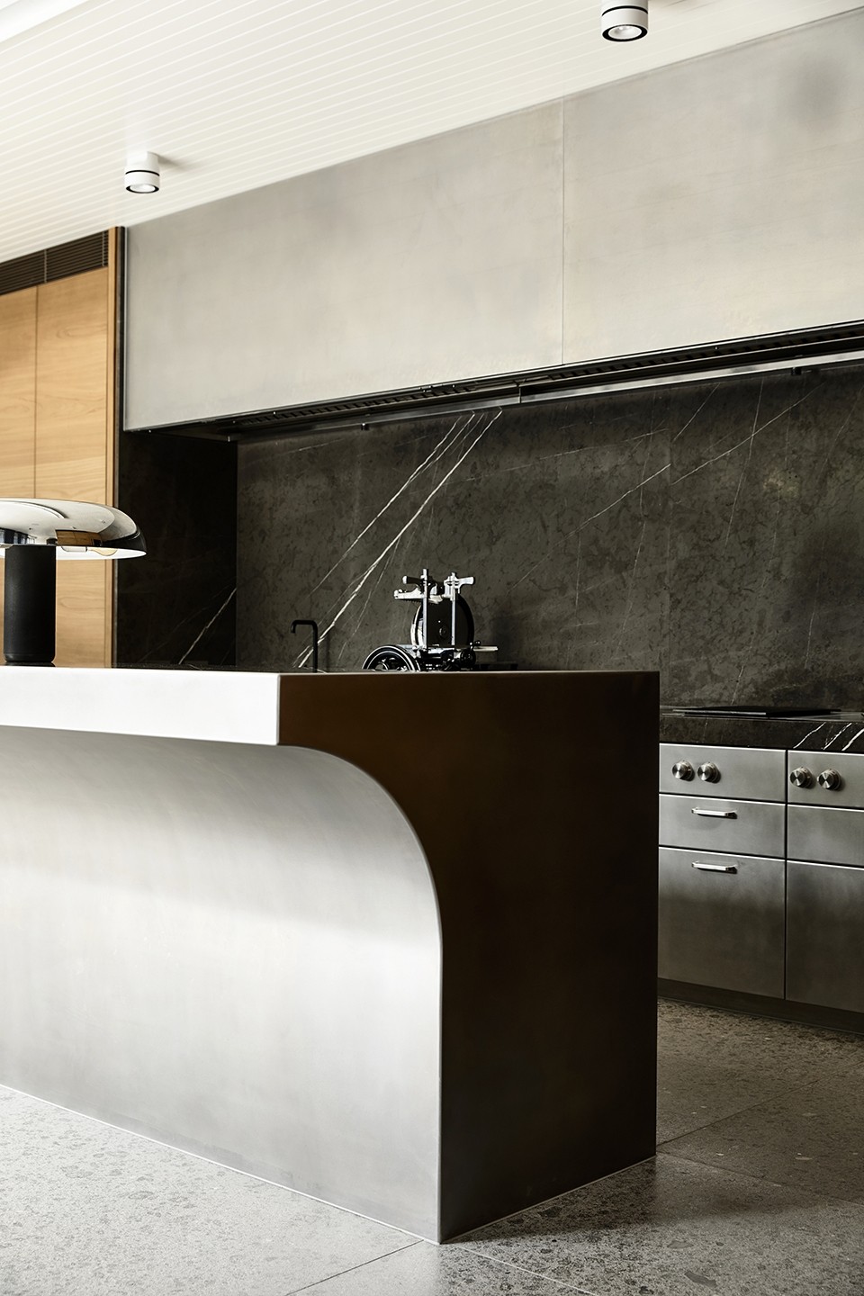 The modern counterpart in the rear extension uses insitu concrete, terrazzo style stone floors, painted timber ceilings and bluestone walling to create a point of difference from the front. Rejecting stark minimalism, the classical details are exchanged for rich textures continuing the hand-hewn character throughout the house.