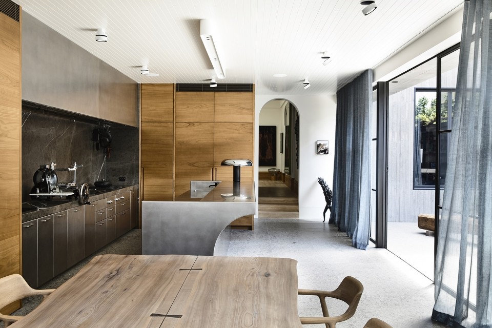 The reworking of older-style details in the front section of the original building, include curved cornices, arched doors and custom steel fireplaces, which are not typical modern construction methodologies, but feel at ease within the Victorian frontage. Integral to the details is an authentic demonstration of unusual level of craftsmanship, an appreciation of the capacity of man-kind. Even the smallest of details, like the hand-stained dovetail joints along the timber skirting, are deserving of a moment’s reflection.