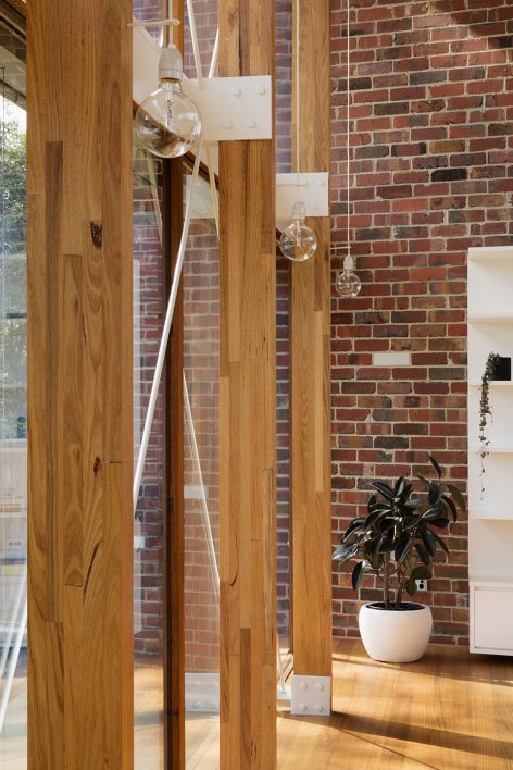 The feeling of being in the new space is of standing on-top the fence, in total connection with the park, with the split level allowing a lofty ceiling to accept the leafy aspect. The pavilion concept emerged organically from here. Timber posts form the boundaries of a “pavilion” and support a timber lined canopy overhead. The rhythm of these posts creates a tactility and depth to the edges of the space, modulating the hardness of the glass surface. The external clinker brick planes reappear to bookend the new interior, suggesting that the living areas are an external space.
