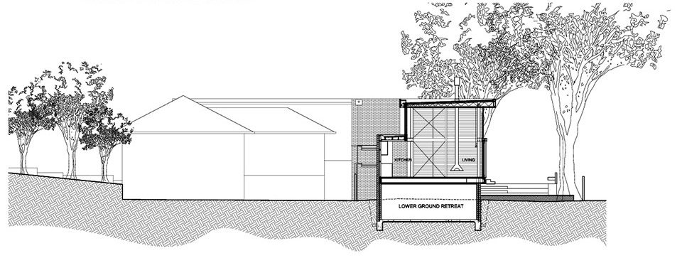 Simple ceramic pendant lights drape down at each post location and a dramatic fireplace reinforce the verticality of both the space and the neighbouring trees. The space defers to its mid-century roots in its horizontality, honesty in steel connections and braces, natural materials and joinery details. An external venetian blind enlarges the ubiquitous 50’s venetian, and the space is furnished with mid-century but forward looking furniture. The new living areas have been sited to face north east and north west. Large expanses of glass are utilized take in the natural beauty and allow winter sun to penetrate deep into the space. Sun penetration is regulated with northern eaves and an external venetian that spans the entire length of the main north eastern and north western fa?ades. All new spaces are naturally cross ventilated, and all natural timber Is native plantation oak.