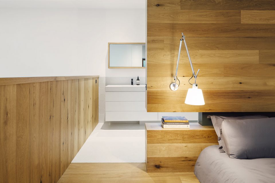 Essentially a simple rectilinear form, the house is orientated with its long side facing north to allow direct natural light access to the living spaces and bedrooms. Service spaces – such as the laundry and circulation hallways – are situated on the south side of the building and feature operable windows to promote passive ventilation. The house is located in a bushfire prone area, which dictated the use of naturally fire resistant Blackbutt window frames and Spotted Gum cladding. “We chose these timbers due to their natural bushfire resistance. Also as they grey off they will start to reflect the grey tones of the surrounding bushland”, said Moloney.
