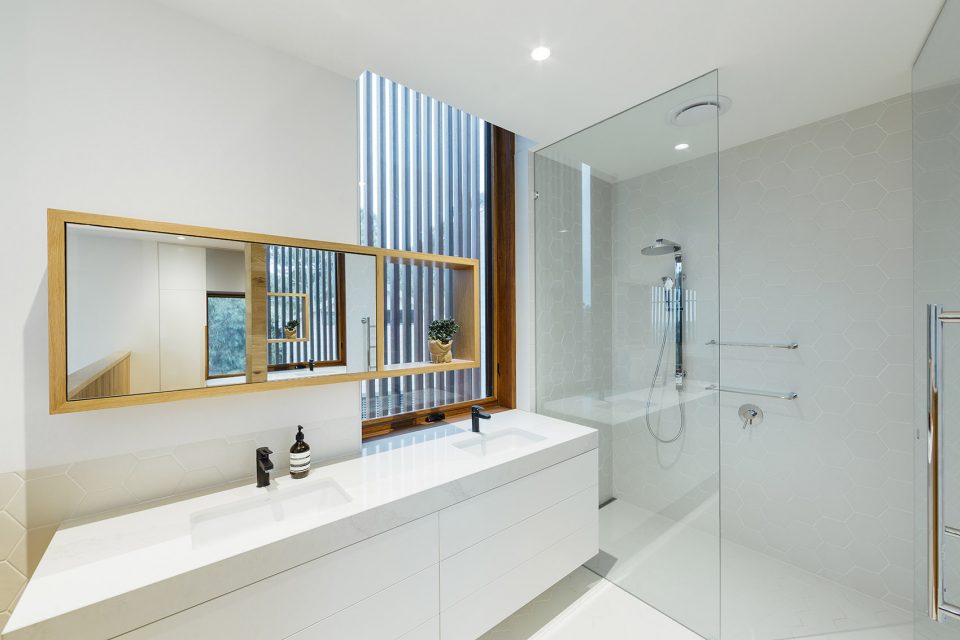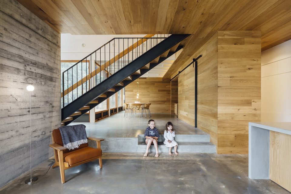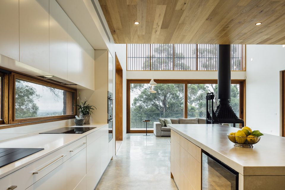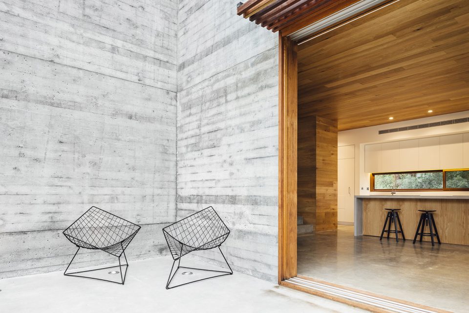 “We initially wanted to elevate the living spaces so that the clients could access views over a line of trees. But given their European background, the clients preferred to have the bedrooms on the upper floor and living spaces on the ground floor”. said Moloney Architects Principal, Mick Moloney. “So rather than going above the canopy, we extended the building out over the hillside to peak out past the line of existing trees. The result is a dramatic 5.5m cantilever that allows the owners to enjoy the view whilst keeping the living spaces at ground level and closely connected to the landscape”.