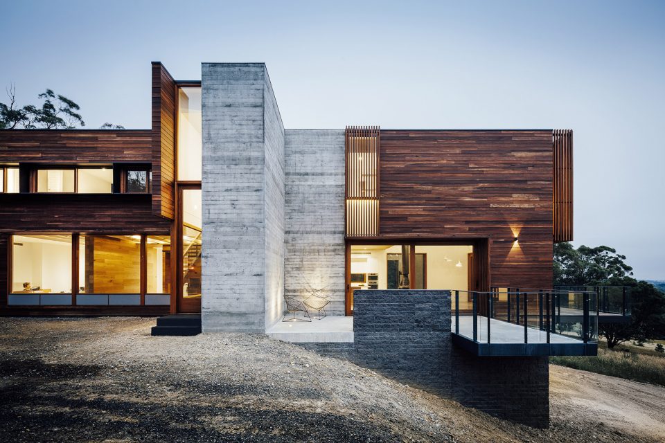 Invermay House is home to a family of six who recently relocated from Ireland to regional Victoria. Cantilevering out over hillside, the house takes in extensive views over the township of Ballarat in western Victoria, Australia. The building is clad in a limited palette of horizontal timber cladding, split-face concrete block, and board-marked ‘off-form’ concrete. The materials are arranged to create continuous horizontal and vertical panels – separated by bands of windows. The effect is a strong geometric composition that uses the weight of the concrete to visually anchor the design to the hillside.