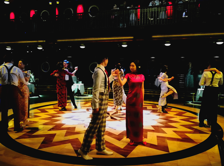手持船票,進入游船一層,首先來到的是舞廳。演員們隨著音樂翩翩起舞,同時,一段一段的小故事,也徐徐展開。他們是演員與導(dǎo)演的相遇,是女作家與愛慕者的相見,是女兒與父親的對話……隔壁的酒吧也一樣熱鬧,熱情事故的小酒保、風(fēng)姿綽約的白玫瑰、儒雅的鋼琴師和風(fēng)流倜儻的薩卡斯手、還有重逢的年輕男女……又是在定格的一瞬間,一幕結(jié)束、一幕開啟,錘撞、推擁人們向前繼續(xù)。